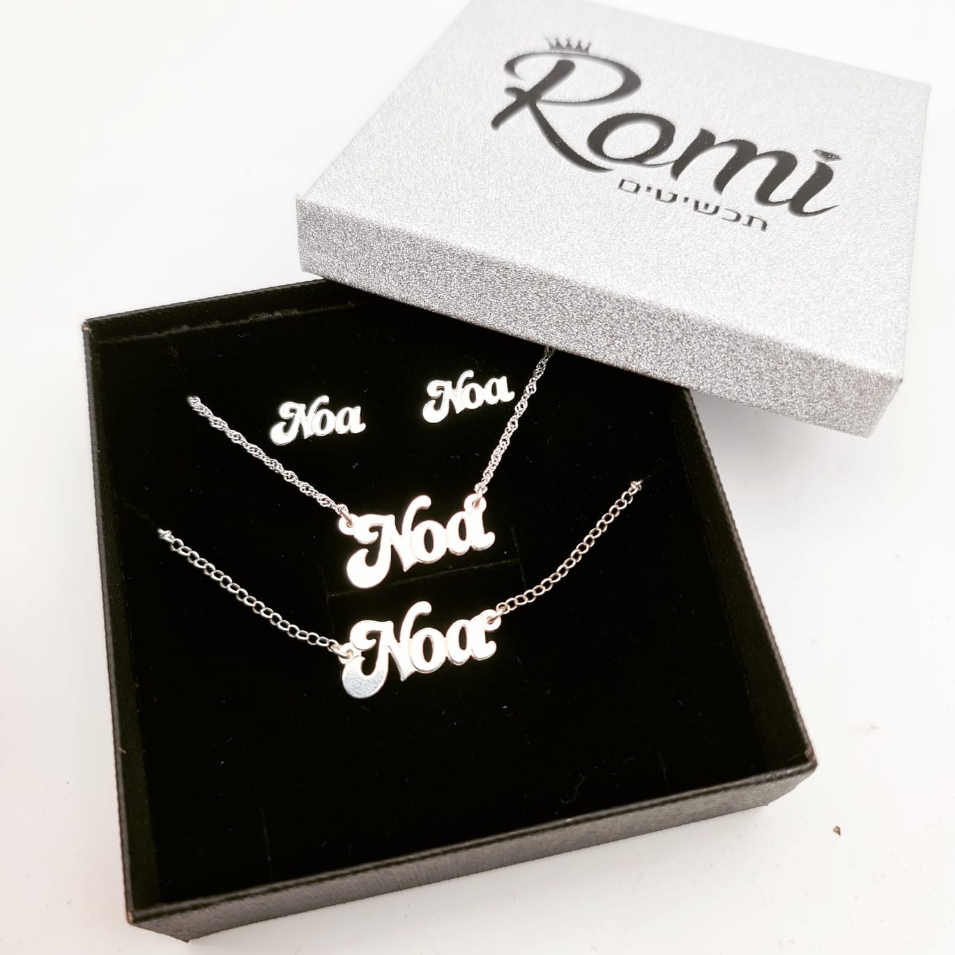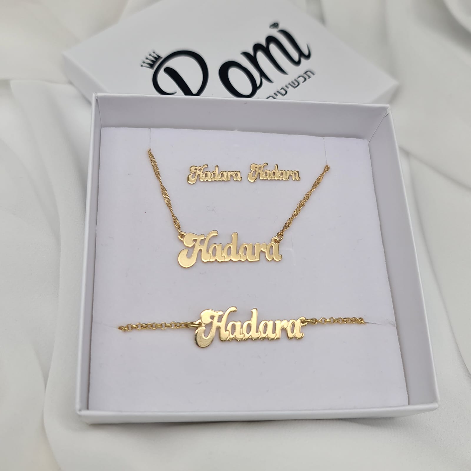 שרשרת , צמיד , זוג עגילי שם