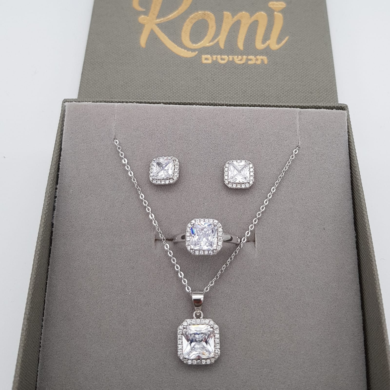 סט סוליטר מרובע משובץ כולל עגילים ,טבעת ,שרשרת,